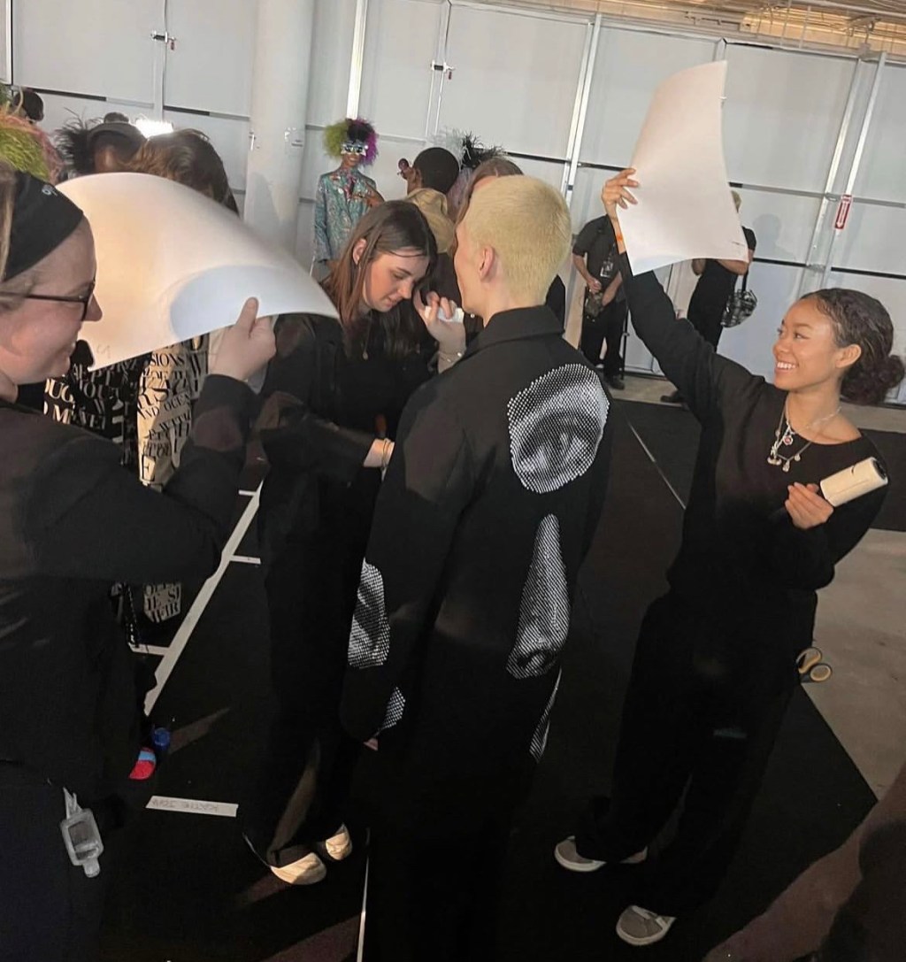 At the end of the show, backstage becomes a place of relief. Filled with laughter and applause at the success of the collection. The team congratulating each other, models laughing together, giving each other a final high five, before changing and all going their separate ways.