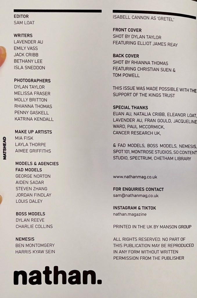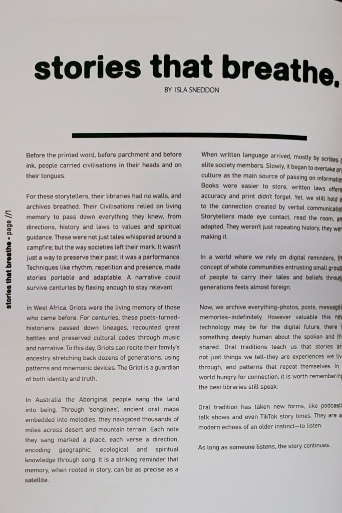 Nathan Magazine 2026: My first published byline is in Nathan magazine, a Manchester based men’s preloved fashion magazine. The piece opens issue 2 of the magazine, with the theme ‘past’. The article talks about the history of storytelling, before the introduction of pen and paper. You can read the piece below, and you can buy the magazine here.