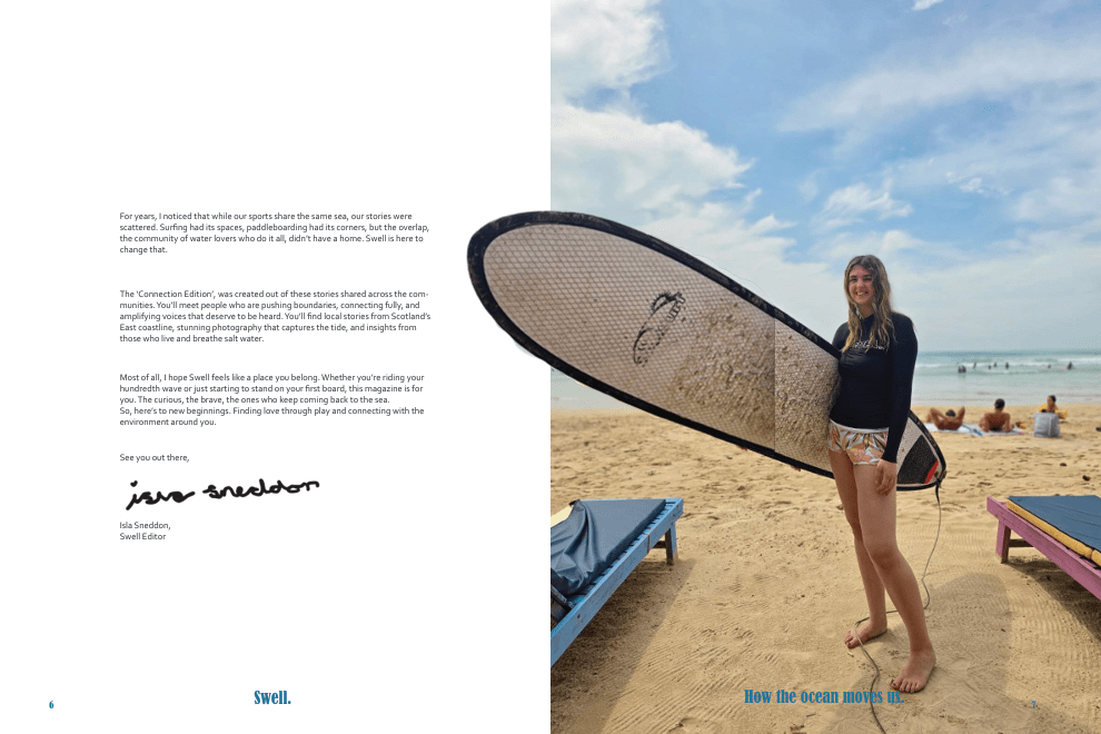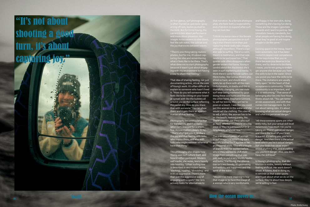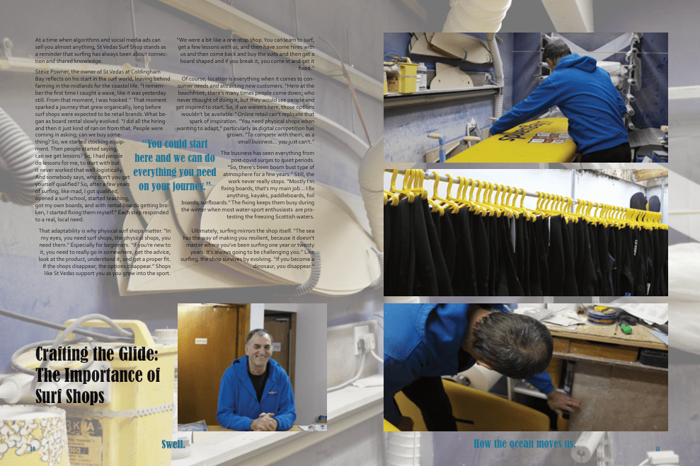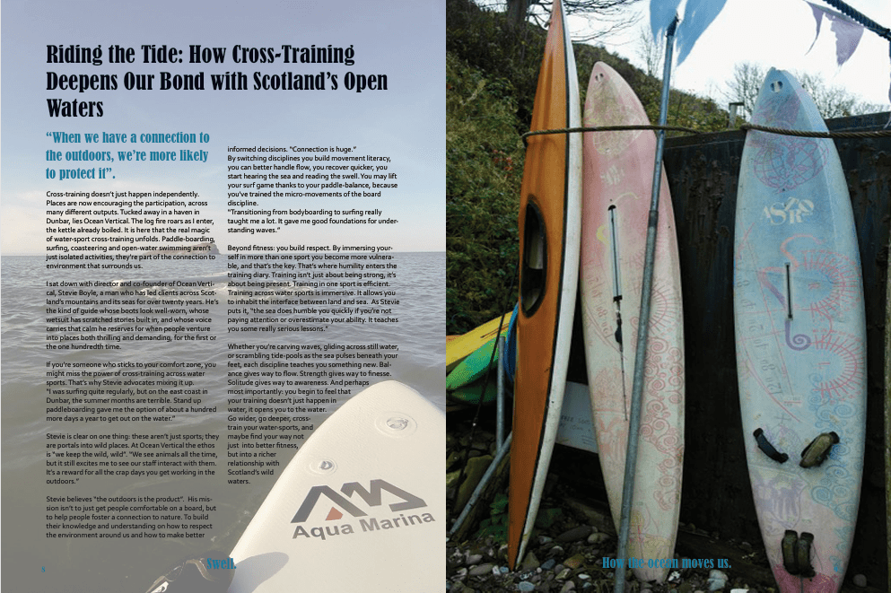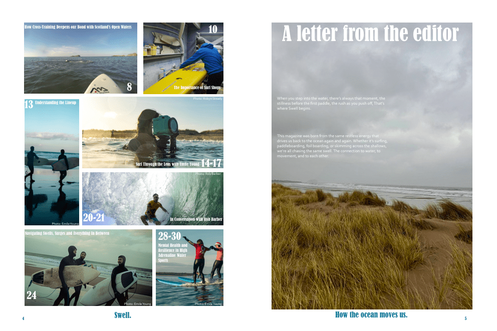 Major Project 2025/26: For my university degree’s major project, I produced my own magazine. This entailed being in charge of writing, editing and designing the final product. My goal of the magazine was to create a space for the intersection of water-sports. I interviewed many people from the community in the East of Scotland. I would like to extend my thanks to Emile Young for use of her photography throughout. You can find her work here. You can see my magazine below.
