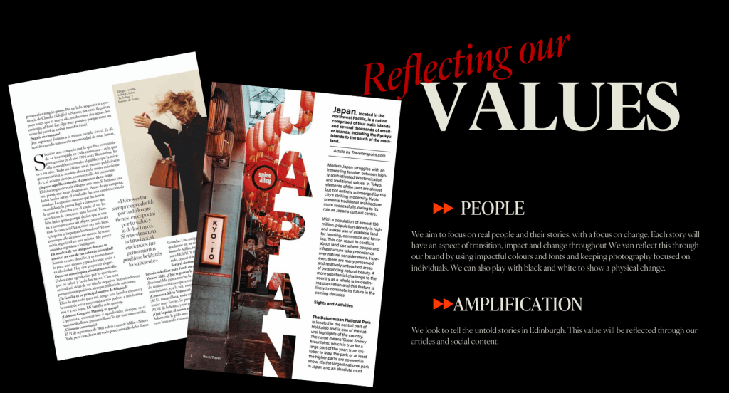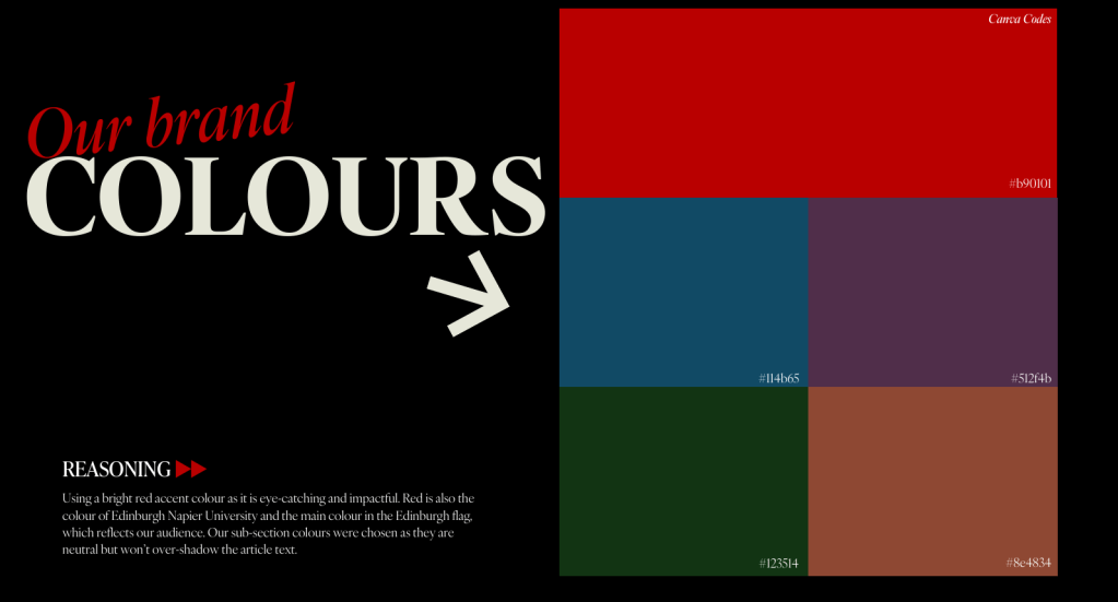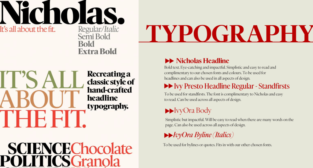 Impulse 2025: Over my time in this university module, I was responsible for ensuring consistency across our in print, website and social platforms. I created a brand guide to allow the other section managers to fit our brand identity and I became a floating member of the design, online and social teams. I had the pleasure of writing two articles, both of which are featured in the final in print magazine, one focusing on accessible sport in Edinburgh and the surrounding areas, and the other looking at the treatment of women in todays society. Below you can see example pages from the brand guide.